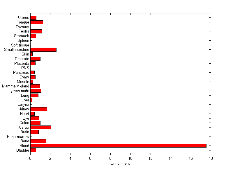 The expression level is normalized with tissue-library size. Each value for a gene in a tissue is a ratio of observed ESTs to the expected one in this tissue. The expected number of ESTs is the product of total ESTs of the gene and the fraction of total ESTs in the tissue among all ESTs in 30 tissues.