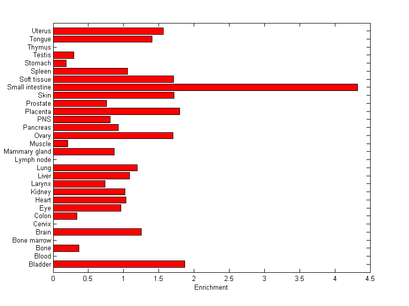 The expression level is normalized with tissue-library size. Each value for a gene in a tissue is a ratio of observed ESTs to the expected one in this tissue. The expected number of ESTs is the product of total ESTs of the gene and the fraction of total ESTs in the tissue among all ESTs in 30 tissues.