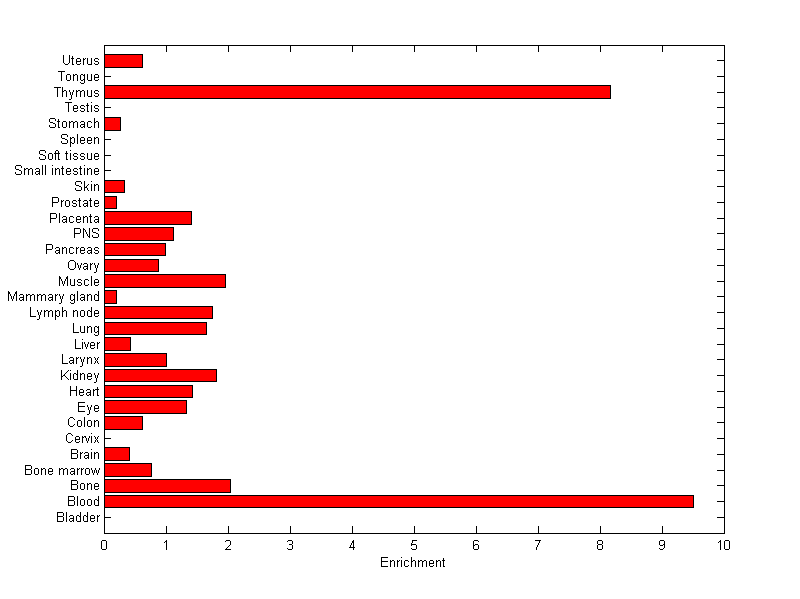 The expression level is normalized with tissue-library size. Each value for a gene in a tissue is a ratio of observed ESTs to the expected one in this tissue. The expected number of ESTs is the product of total ESTs of the gene and the fraction of total ESTs in the tissue among all ESTs in 30 tissues.