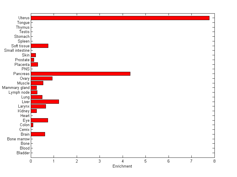 The expression level is normalized with tissue-library size. Each value for a gene in a tissue is a ratio of observed ESTs to the expected one in this tissue. The expected number of ESTs is the product of total ESTs of the gene and the fraction of total ESTs in the tissue among all ESTs in 30 tissues.