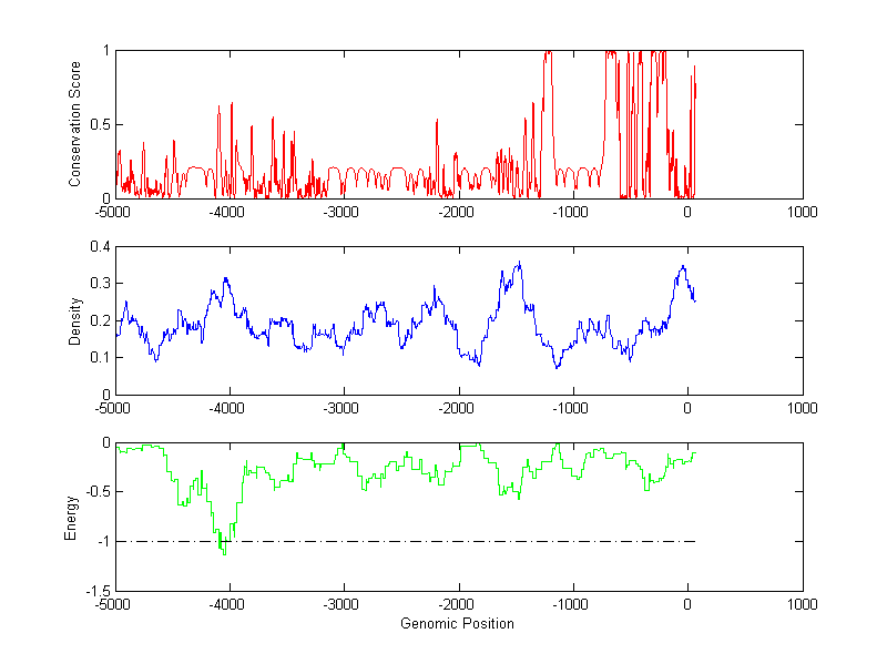The energy profile (green curve) is about energy for module detection based on TF interaction. The positions with energy less than -1 indicate the existence of CRMs.