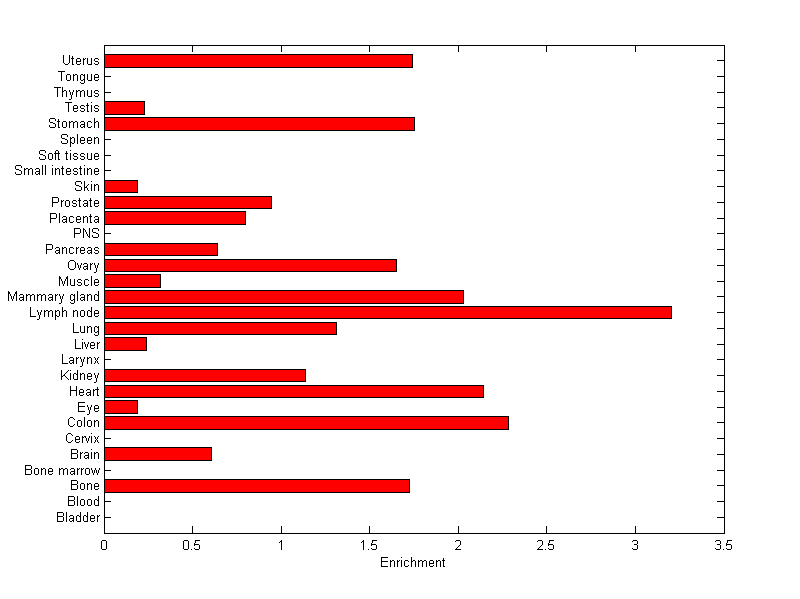 The expression level is normalized with tissue-library size. Each value for a gene in a tissue is a ratio of observed ESTs to the expected one in this tissue. The expected number of ESTs is the product of total ESTs of the gene and the fraction of total ESTs in the tissue among all ESTs in 30 tissues.