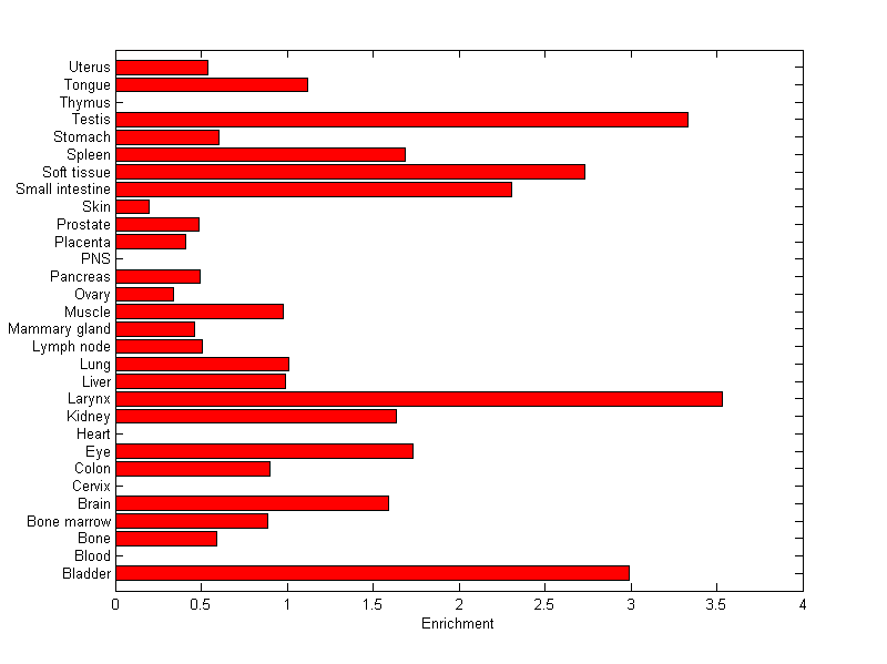 The expression level is normalized with tissue-library size. Each value for a gene in a tissue is a ratio of observed ESTs to the expected one in this tissue. The expected number of ESTs is the product of total ESTs of the gene and the fraction of total ESTs in the tissue among all ESTs in 30 tissues.