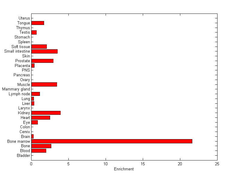 The expression level is normalized with tissue-library size. Each value for a gene in a tissue is a ratio of observed ESTs to the expected one in this tissue. The expected number of ESTs is the product of total ESTs of the gene and the fraction of total ESTs in the tissue among all ESTs in 30 tissues.