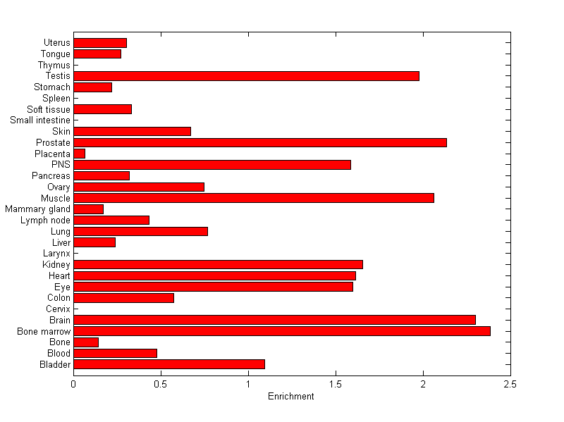 The expression level is normalized with tissue-library size. Each value for a gene in a tissue is a ratio of observed ESTs to the expected one in this tissue. The expected number of ESTs is the product of total ESTs of the gene and the fraction of total ESTs in the tissue among all ESTs in 30 tissues.