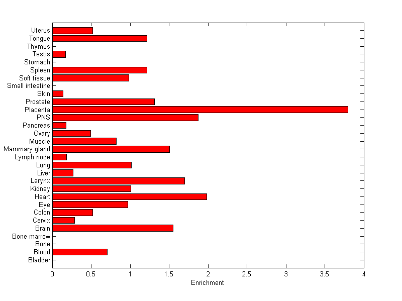 The expression level is normalized with tissue-library size. Each value for a gene in a tissue is a ratio of observed ESTs to the expected one in this tissue. The expected number of ESTs is the product of total ESTs of the gene and the fraction of total ESTs in the tissue among all ESTs in 30 tissues.
