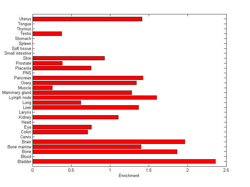 The expression level is normalized with tissue-library size. Each value for a gene in a tissue is a ratio of observed ESTs to the expected one in this tissue. The expected number of ESTs is the product of total ESTs of the gene and the fraction of total ESTs in the tissue among all ESTs in 30 tissues.