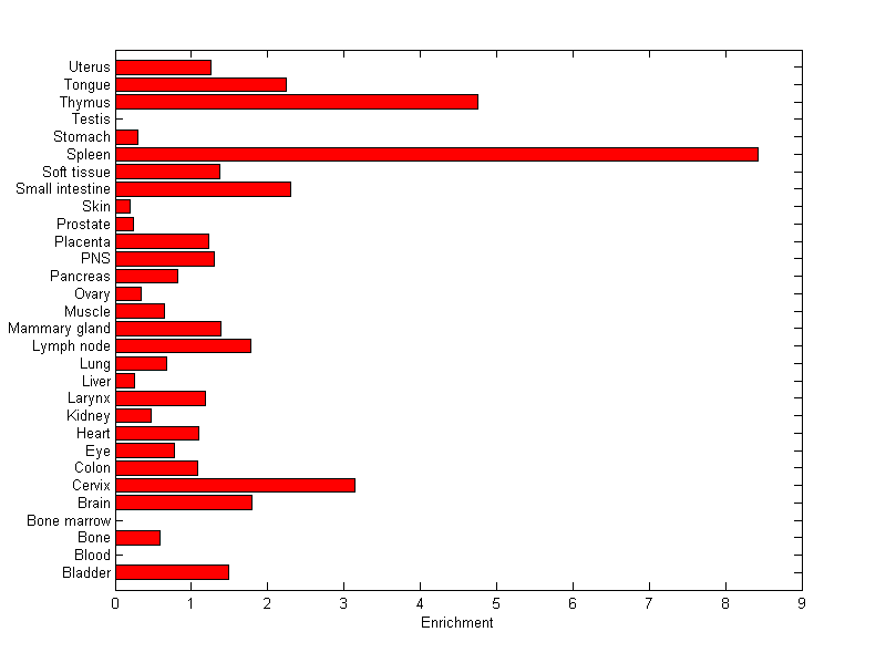 The expression level is normalized with tissue-library size. Each value for a gene in a tissue is a ratio of observed ESTs to the expected one in this tissue. The expected number of ESTs is the product of total ESTs of the gene and the fraction of total ESTs in the tissue among all ESTs in 30 tissues.