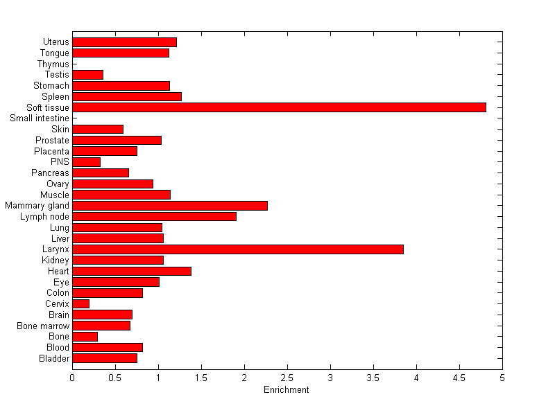 The expression level is normalized with tissue-library size. Each value for a gene in a tissue is a ratio of observed ESTs to the expected one in this tissue. The expected number of ESTs is the product of total ESTs of the gene and the fraction of total ESTs in the tissue among all ESTs in 30 tissues.
