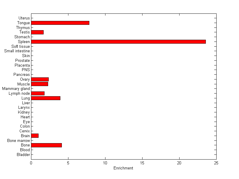 The expression level is normalized with tissue-library size. Each value for a gene in a tissue is a ratio of observed ESTs to the expected one in this tissue. The expected number of ESTs is the product of total ESTs of the gene and the fraction of total ESTs in the tissue among all ESTs in 30 tissues.