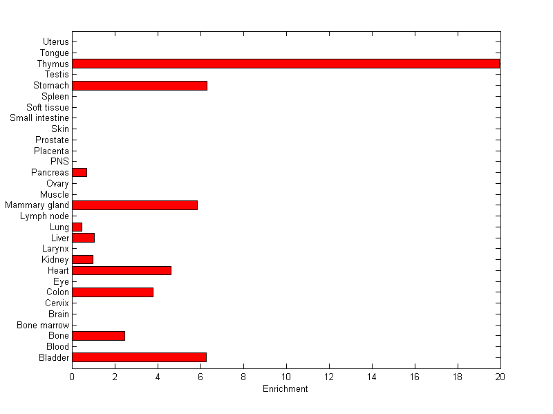 The expression level is normalized with tissue-library size. Each value for a gene in a tissue is a ratio of observed ESTs to the expected one in this tissue. The expected number of ESTs is the product of total ESTs of the gene and the fraction of total ESTs in the tissue among all ESTs in 30 tissues.
