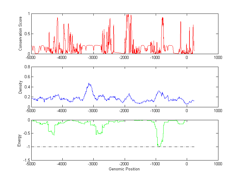 About the profiles: The conservation profile (red curve) is about conservation scores of the promoter sequences. Conservation was determined from an eight-way alignment of human, chimpanzee, dog, mouse, rat, chicken, zebrafish and fugu sequences. The conservation was quantified by a conservation score between 0 and 1, with 1 as highest conservation. The conservation score was obtained from UCSC genome databases. The density profile (blue curve) is about density of all TF binding sites. The energy profile (green curve) is about energy for module detection based on TF interaction. The positions with energy less than -1 indicate the existence of CRMs. Download: Conservation profileDensity profile Energy profile CRM summary |
