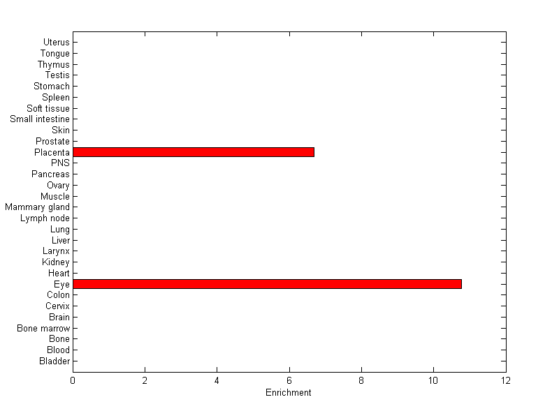 About the profile: The expression level is normalized with tissue-library size. Each value for a gene in a tissue is a ratio of observed ESTs to the expected one in this tissue. The expected number of ESTs is the product of total ESTs of the gene and the fraction of total ESTs in the tissue among all ESTs in 30 tissues. Summary: This gene is preferentially expressed in [eye, placenta] Download: |