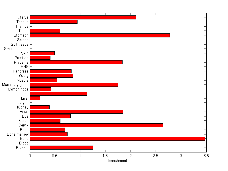 The expression level is normalized with tissue-library size. Each value for a gene in a tissue is a ratio of observed ESTs to the expected one in this tissue. The expected number of ESTs is the product of total ESTs of the gene and the fraction of total ESTs in the tissue among all ESTs in 30 tissues.