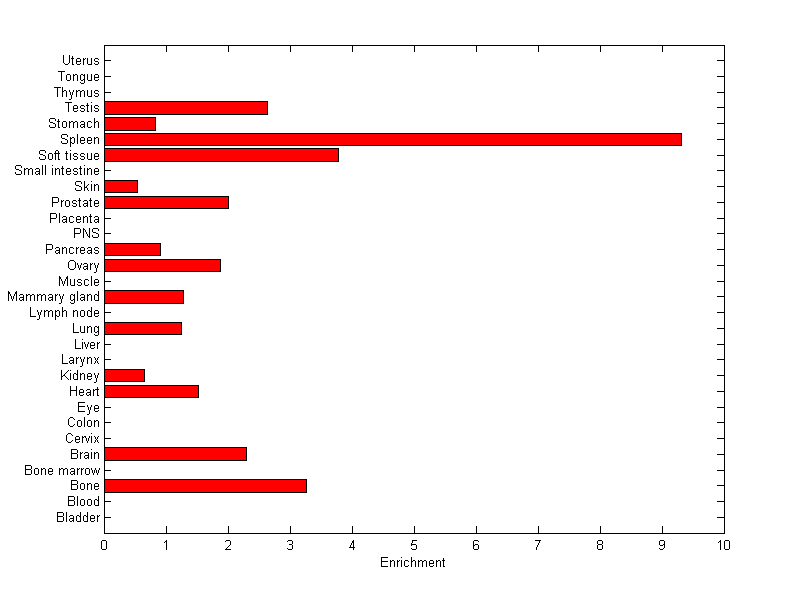 The expression level is normalized with tissue-library size. Each value for a gene in a tissue is a ratio of observed ESTs to the expected one in this tissue. The expected number of ESTs is the product of total ESTs of the gene and the fraction of total ESTs in the tissue among all ESTs in 30 tissues.