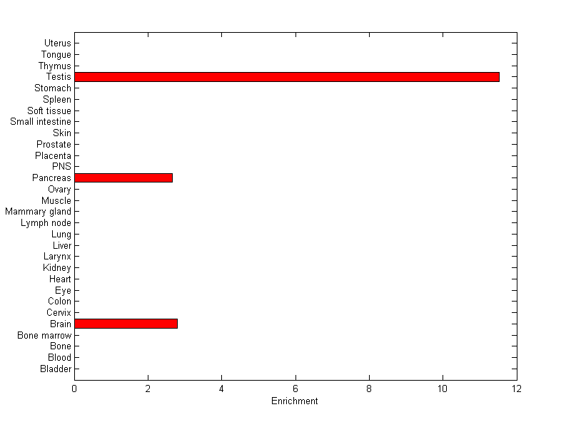 The expression level is normalized with tissue-library size. Each value for a gene in a tissue is a ratio of observed ESTs to the expected one in this tissue. The expected number of ESTs is the product of total ESTs of the gene and the fraction of total ESTs in the tissue among all ESTs in 30 tissues.