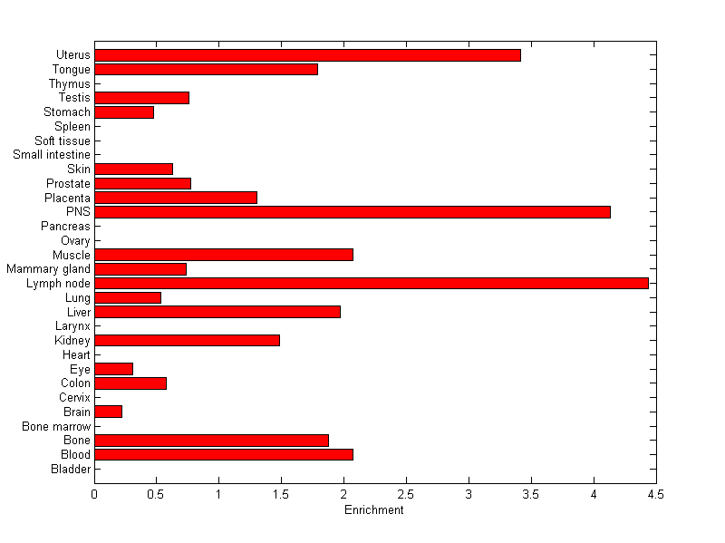 The expression level is normalized with tissue-library size. Each value for a gene in a tissue is a ratio of observed ESTs to the expected one in this tissue. The expected number of ESTs is the product of total ESTs of the gene and the fraction of total ESTs in the tissue among all ESTs in 30 tissues.