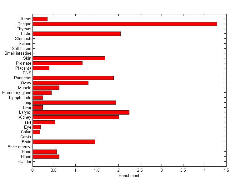 The expression level is normalized with tissue-library size. Each value for a gene in a tissue is a ratio of observed ESTs to the expected one in this tissue. The expected number of ESTs is the product of total ESTs of the gene and the fraction of total ESTs in the tissue among all ESTs in 30 tissues.