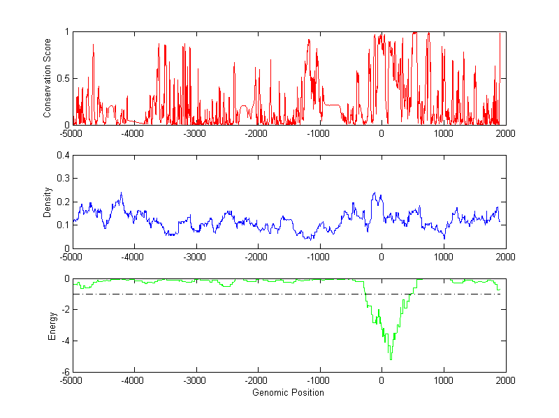 The energy profile (green curve) is about energy for module detection based on TF interaction. The positions with energy less than -1 indicate the existence of CRMs.