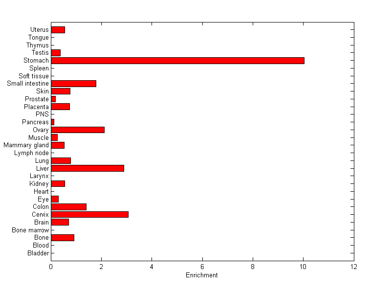 The expression level is normalized with tissue-library size. Each value for a gene in a tissue is a ratio of observed ESTs to the expected one in this tissue. The expected number of ESTs is the product of total ESTs of the gene and the fraction of total ESTs in the tissue among all ESTs in 30 tissues.