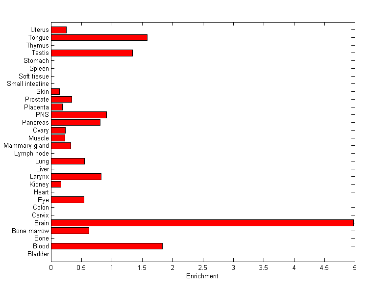 The expression level is normalized with tissue-library size. Each value for a gene in a tissue is a ratio of observed ESTs to the expected one in this tissue. The expected number of ESTs is the product of total ESTs of the gene and the fraction of total ESTs in the tissue among all ESTs in 30 tissues.
