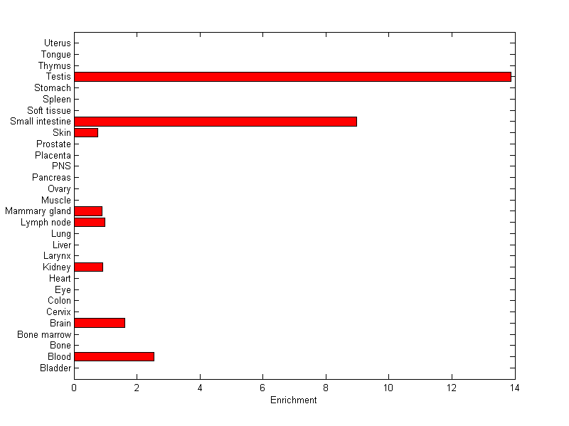 The expression level is normalized with tissue-library size. Each value for a gene in a tissue is a ratio of observed ESTs to the expected one in this tissue. The expected number of ESTs is the product of total ESTs of the gene and the fraction of total ESTs in the tissue among all ESTs in 30 tissues.