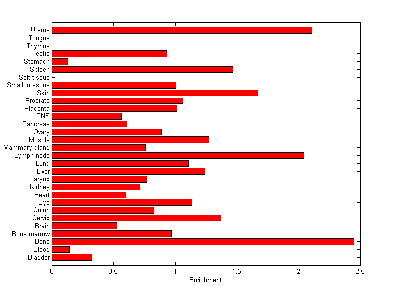 The expression level is normalized with tissue-library size. Each value for a gene in a tissue is a ratio of observed ESTs to the expected one in this tissue. The expected number of ESTs is the product of total ESTs of the gene and the fraction of total ESTs in the tissue among all ESTs in 30 tissues.