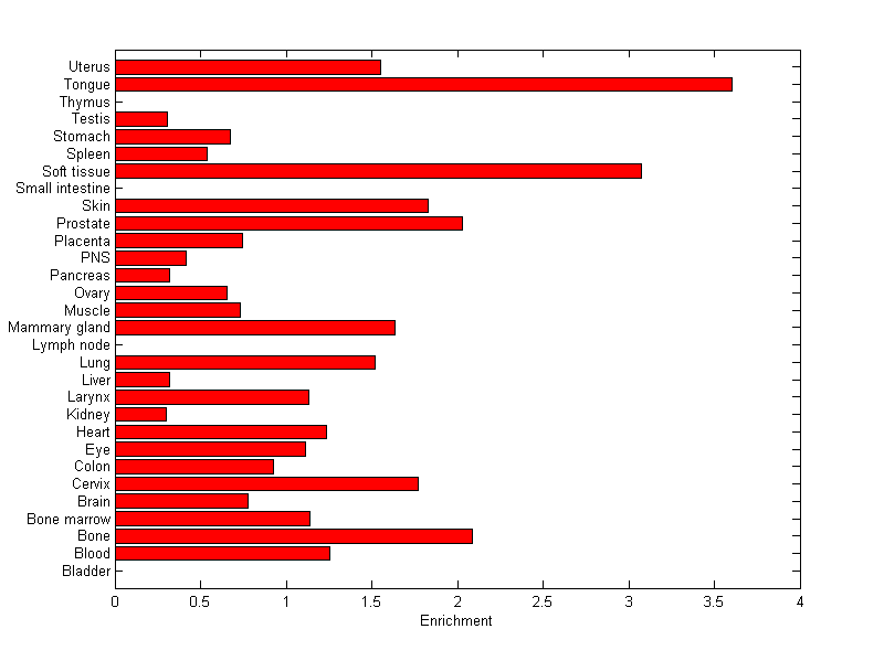 The expression level is normalized with tissue-library size. Each value for a gene in a tissue is a ratio of observed ESTs to the expected one in this tissue. The expected number of ESTs is the product of total ESTs of the gene and the fraction of total ESTs in the tissue among all ESTs in 30 tissues.