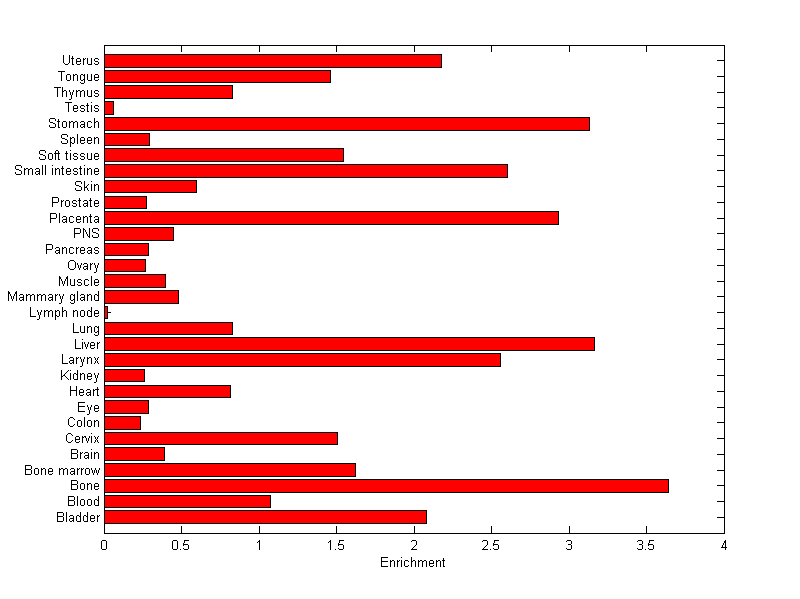 The expression level is normalized with tissue-library size. Each value for a gene in a tissue is a ratio of observed ESTs to the expected one in this tissue. The expected number of ESTs is the product of total ESTs of the gene and the fraction of total ESTs in the tissue among all ESTs in 30 tissues.
