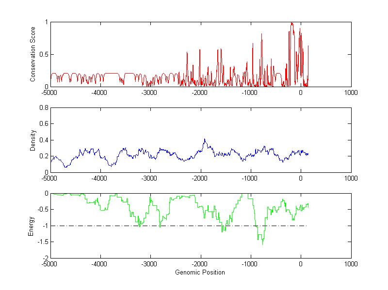The energy profile (green curve) is about energy for module detection based on TF interaction. The positions with energy less than -1 indicate the existence of CRMs.