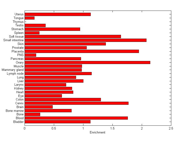 The expression level is normalized with tissue-library size. Each value for a gene in a tissue is a ratio of observed ESTs to the expected one in this tissue. The expected number of ESTs is the product of total ESTs of the gene and the fraction of total ESTs in the tissue among all ESTs in 30 tissues.