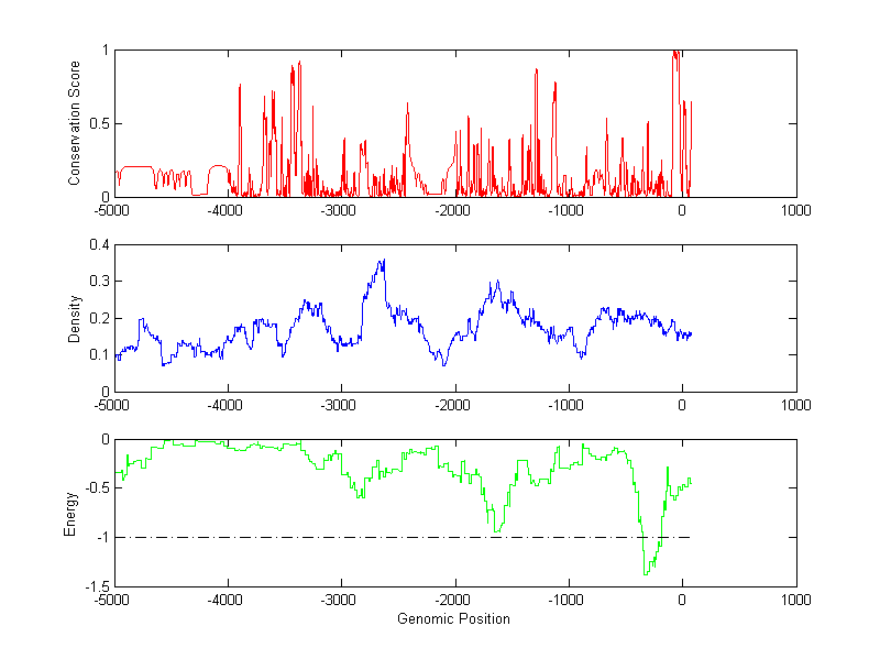 The energy profile (green curve) is about energy for module detection based on TF interaction. The positions with energy less than -1 indicate the existence of CRMs.