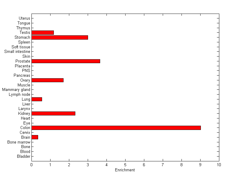 The expression level is normalized with tissue-library size. Each value for a gene in a tissue is a ratio of observed ESTs to the expected one in this tissue. The expected number of ESTs is the product of total ESTs of the gene and the fraction of total ESTs in the tissue among all ESTs in 30 tissues.