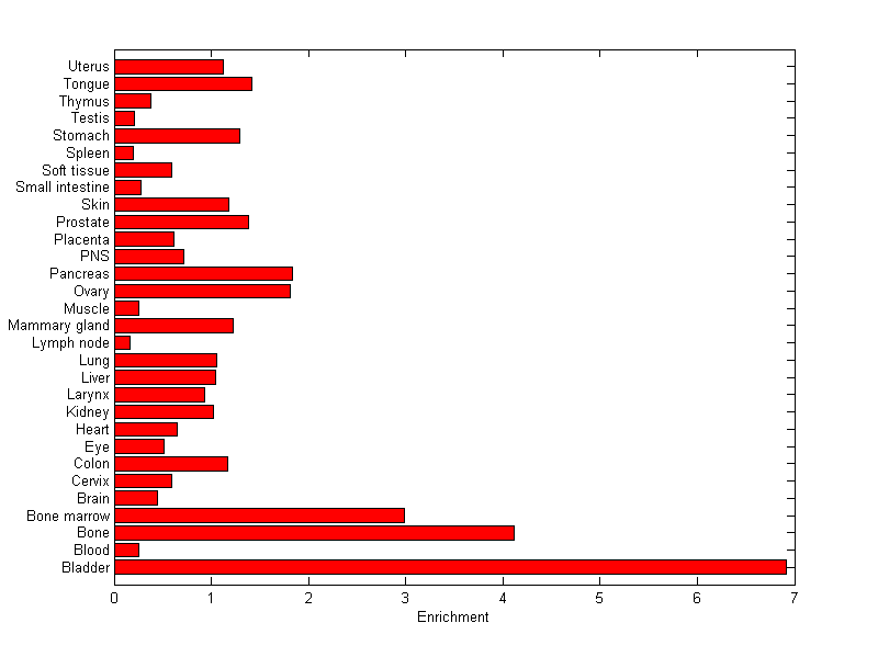 The expression level is normalized with tissue-library size. Each value for a gene in a tissue is a ratio of observed ESTs to the expected one in this tissue. The expected number of ESTs is the product of total ESTs of the gene and the fraction of total ESTs in the tissue among all ESTs in 30 tissues.