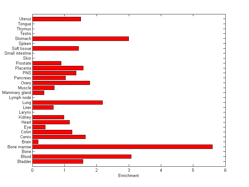 The expression level is normalized with tissue-library size. Each value for a gene in a tissue is a ratio of observed ESTs to the expected one in this tissue. The expected number of ESTs is the product of total ESTs of the gene and the fraction of total ESTs in the tissue among all ESTs in 30 tissues.