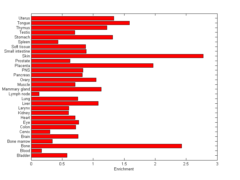 The expression level is normalized with tissue-library size. Each value for a gene in a tissue is a ratio of observed ESTs to the expected one in this tissue. The expected number of ESTs is the product of total ESTs of the gene and the fraction of total ESTs in the tissue among all ESTs in 30 tissues.