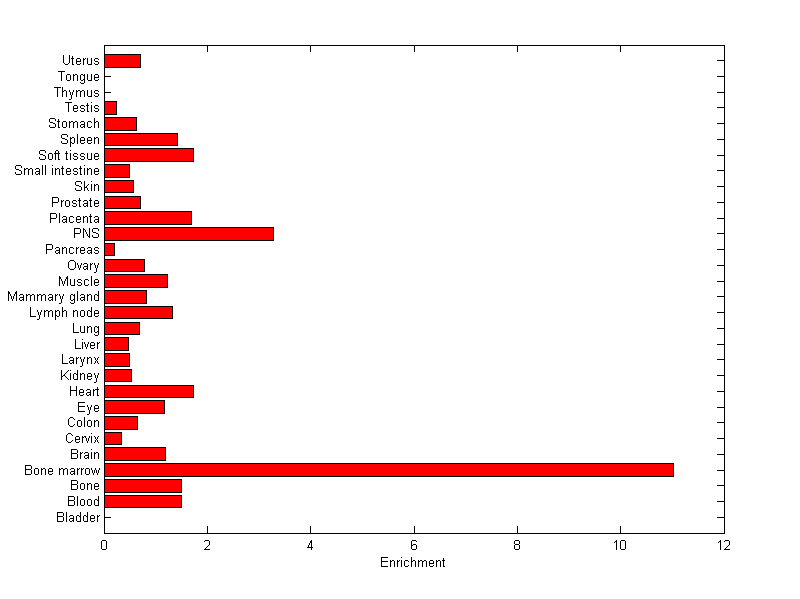 About the profile: The expression level is normalized with tissue-library size. Each value for a gene in a tissue is a ratio of observed ESTs to the expected one in this tissue. The expected number of ESTs is the product of total ESTs of the gene and the fraction of total ESTs in the tissue among all ESTs in 30 tissues. Summary: This gene is preferentially expressed in [bone_marrow] Download: |
