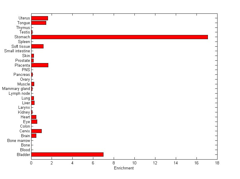 About the profile: The expression level is normalized with tissue-library size. Each value for a gene in a tissue is a ratio of observed ESTs to the expected one in this tissue. The expected number of ESTs is the product of total ESTs of the gene and the fraction of total ESTs in the tissue among all ESTs in 30 tissues. Summary: This gene is preferentially expressed in [bladder, stomach] Download: |