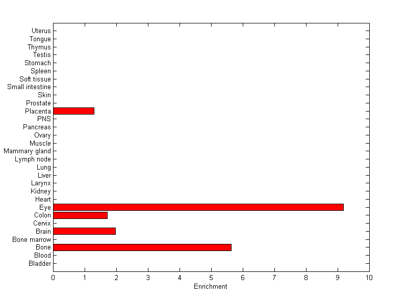 The expression level is normalized with tissue-library size. Each value for a gene in a tissue is a ratio of observed ESTs to the expected one in this tissue. The expected number of ESTs is the product of total ESTs of the gene and the fraction of total ESTs in the tissue among all ESTs in 30 tissues.