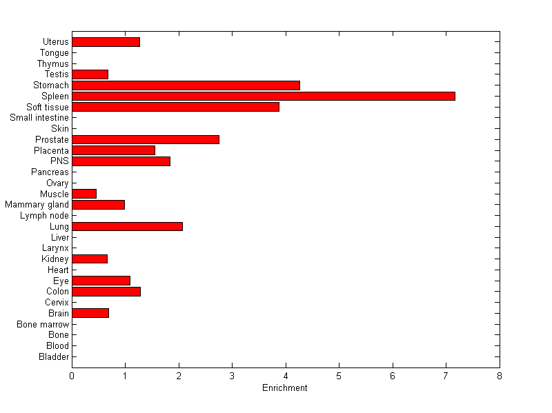 The expression level is normalized with tissue-library size. Each value for a gene in a tissue is a ratio of observed ESTs to the expected one in this tissue. The expected number of ESTs is the product of total ESTs of the gene and the fraction of total ESTs in the tissue among all ESTs in 30 tissues.