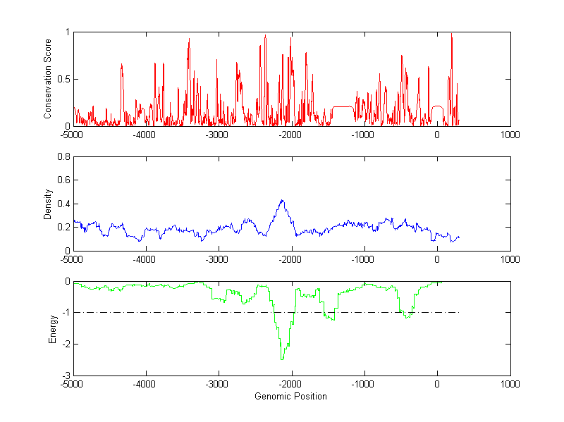 The energy profile (green curve) is about energy for module detection based on TF interaction. The positions with energy less than -1 indicate the existence of CRMs.