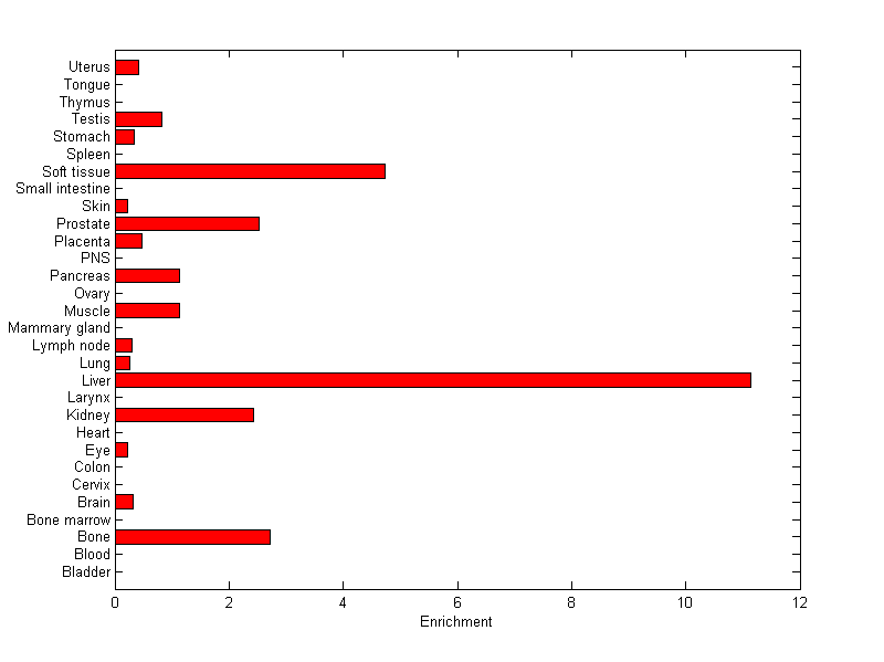 The expression level is normalized with tissue-library size. Each value for a gene in a tissue is a ratio of observed ESTs to the expected one in this tissue. The expected number of ESTs is the product of total ESTs of the gene and the fraction of total ESTs in the tissue among all ESTs in 30 tissues.