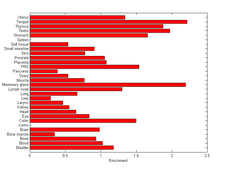 The expression level is normalized with tissue-library size. Each value for a gene in a tissue is a ratio of observed ESTs to the expected one in this tissue. The expected number of ESTs is the product of total ESTs of the gene and the fraction of total ESTs in the tissue among all ESTs in 30 tissues.
