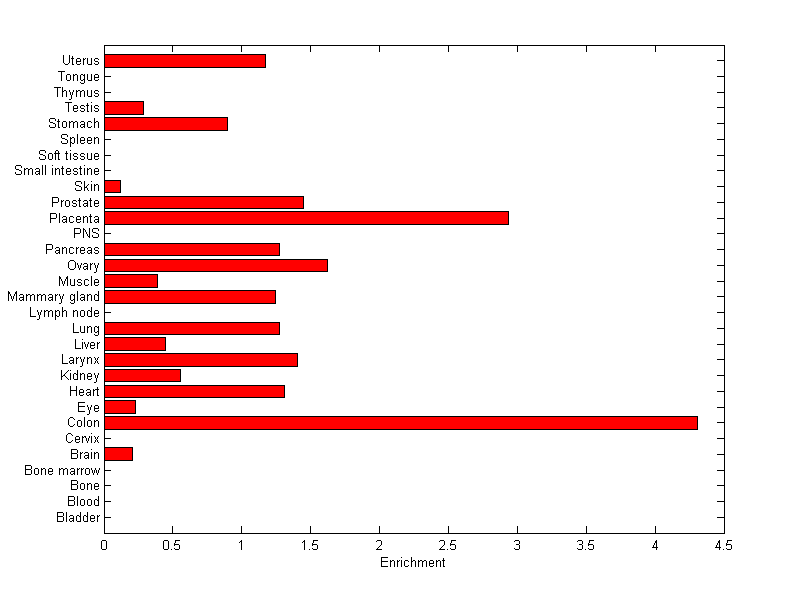 The expression level is normalized with tissue-library size. Each value for a gene in a tissue is a ratio of observed ESTs to the expected one in this tissue. The expected number of ESTs is the product of total ESTs of the gene and the fraction of total ESTs in the tissue among all ESTs in 30 tissues.