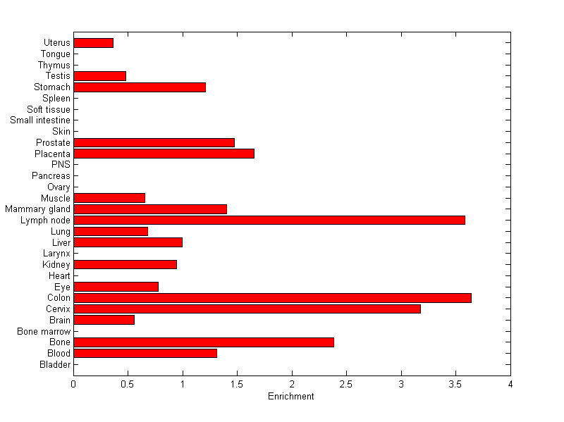 The expression level is normalized with tissue-library size. Each value for a gene in a tissue is a ratio of observed ESTs to the expected one in this tissue. The expected number of ESTs is the product of total ESTs of the gene and the fraction of total ESTs in the tissue among all ESTs in 30 tissues.