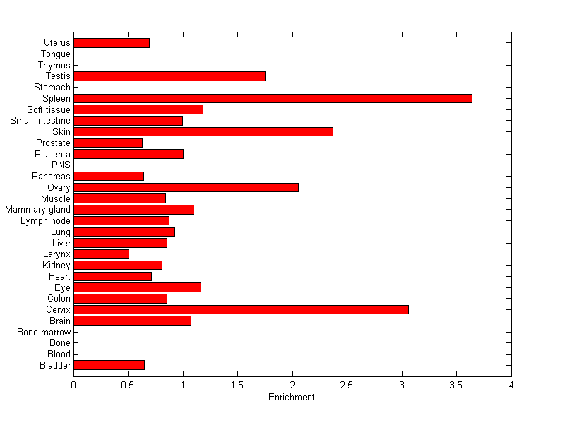 The expression level is normalized with tissue-library size. Each value for a gene in a tissue is a ratio of observed ESTs to the expected one in this tissue. The expected number of ESTs is the product of total ESTs of the gene and the fraction of total ESTs in the tissue among all ESTs in 30 tissues.