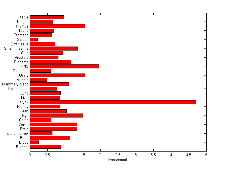 The expression level is normalized with tissue-library size. Each value for a gene in a tissue is a ratio of observed ESTs to the expected one in this tissue. The expected number of ESTs is the product of total ESTs of the gene and the fraction of total ESTs in the tissue among all ESTs in 30 tissues.