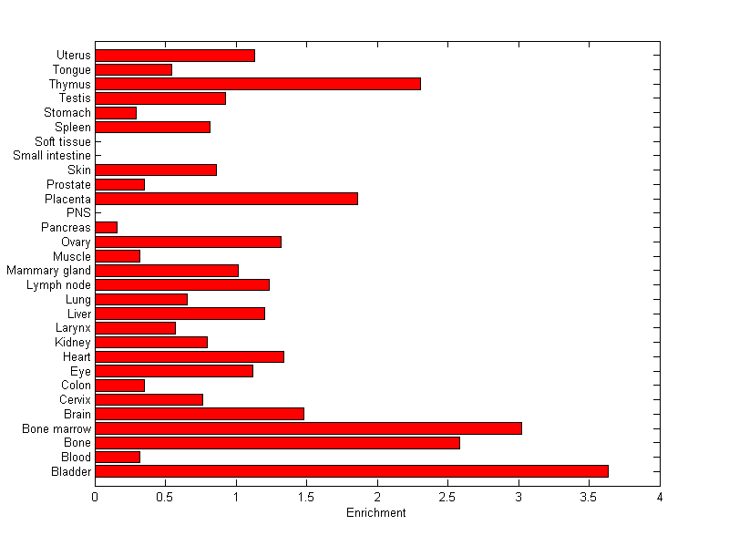 The expression level is normalized with tissue-library size. Each value for a gene in a tissue is a ratio of observed ESTs to the expected one in this tissue. The expected number of ESTs is the product of total ESTs of the gene and the fraction of total ESTs in the tissue among all ESTs in 30 tissues.