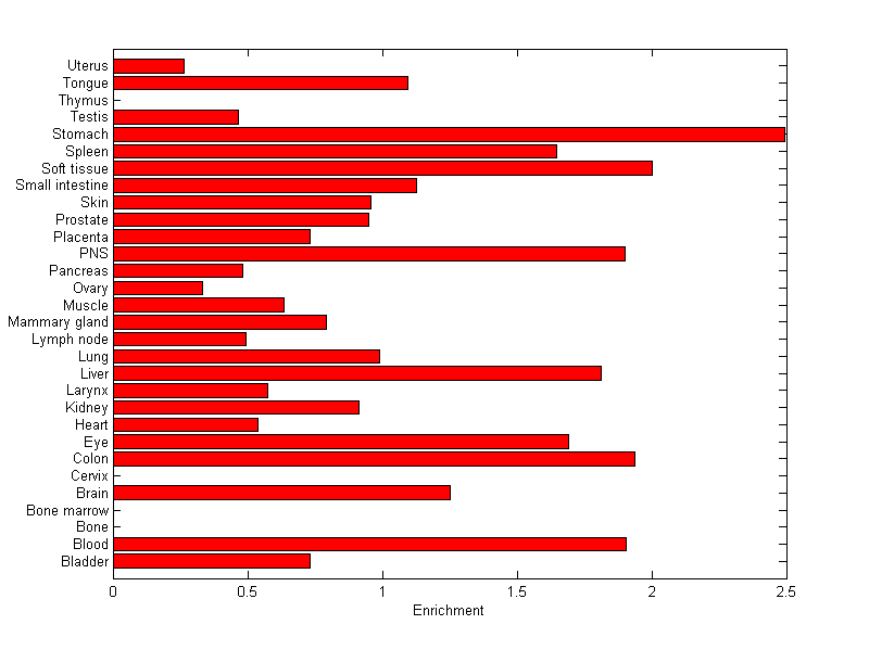 The expression level is normalized with tissue-library size. Each value for a gene in a tissue is a ratio of observed ESTs to the expected one in this tissue. The expected number of ESTs is the product of total ESTs of the gene and the fraction of total ESTs in the tissue among all ESTs in 30 tissues.