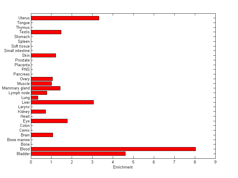 The expression level is normalized with tissue-library size. Each value for a gene in a tissue is a ratio of observed ESTs to the expected one in this tissue. The expected number of ESTs is the product of total ESTs of the gene and the fraction of total ESTs in the tissue among all ESTs in 30 tissues.